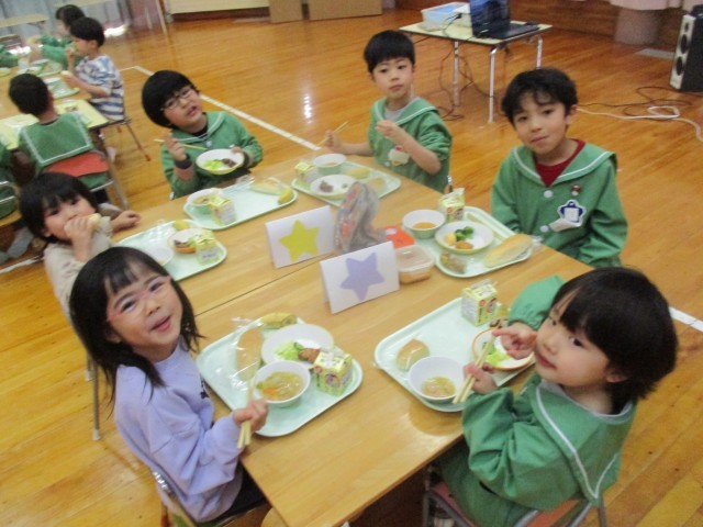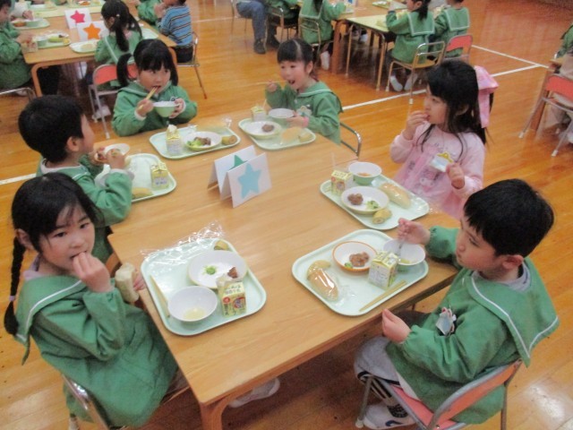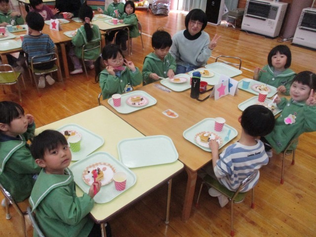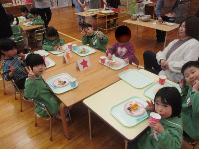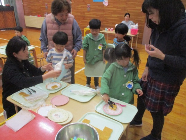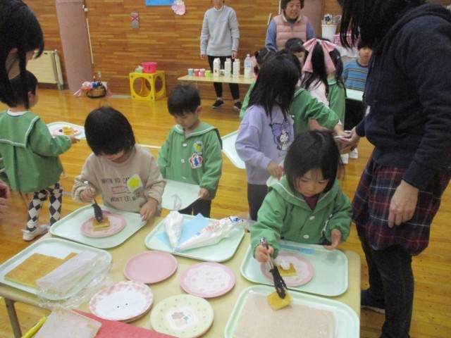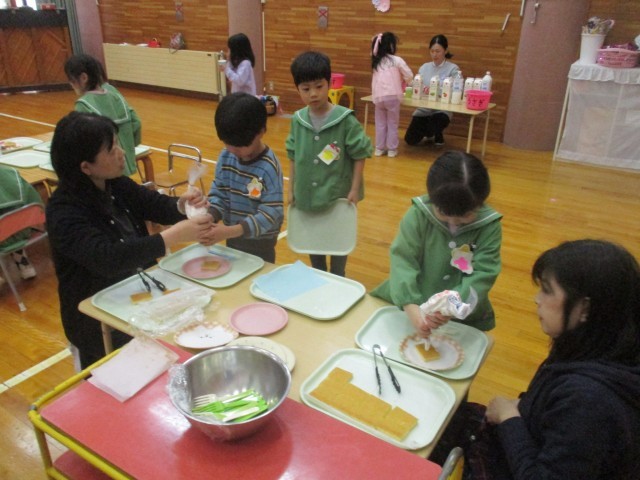 お昼からはお別れ会食をし、食後にケーキのトッピングをしました。スポンジケーキにクリームをしぼり、好きなお菓子をのせて自分だけの特製ケーキをつくりました。みんなで味わって食べ、とても楽しい時間となりました。最後にぞう組さんの赤ちゃんだった時の写真でクイズをすると、意外にもなかなか分からなかったようで、とても盛り上がりました。赤ちゃんの時からこんなに大きくなったのだとぞう組さんの成長を感じるひと時でした。来週はビンゴゲームをする予定です。ぞう組さんとの時間を楽しみたいと思います