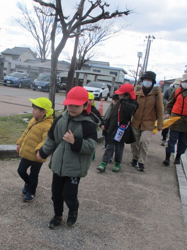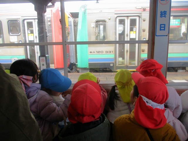 今日は、速星駅まで散歩に行ってきました。4月から歩いて学校に通う年長組さん。幼稚園で最後の交通安全指導を兼ねた散歩になりました。道路を渡る前には止まって、車が来ないか右左を確認したり、手をつなぐときは年長児が道路側になって歩いたりしてくれました。歩いている途中で菜の花を見つけ、ほんの少し春を感じることもできました。また一つ年長組との思い出ができましたね。