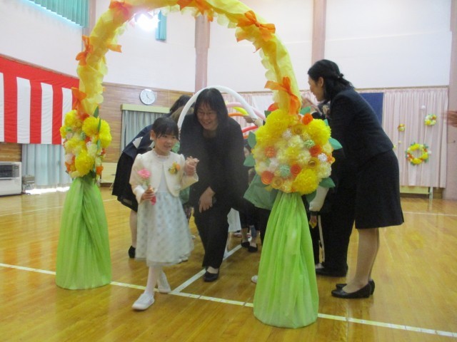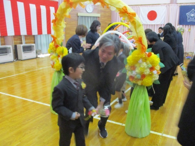 記念写真撮影をして、いよいよ見送りの時です。うさぎ組、りす組の友達や先生たちがバルーンでトンネルをつくってくれ、親子で嬉しそうに歩きました。