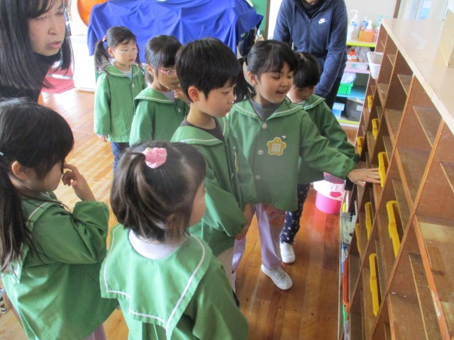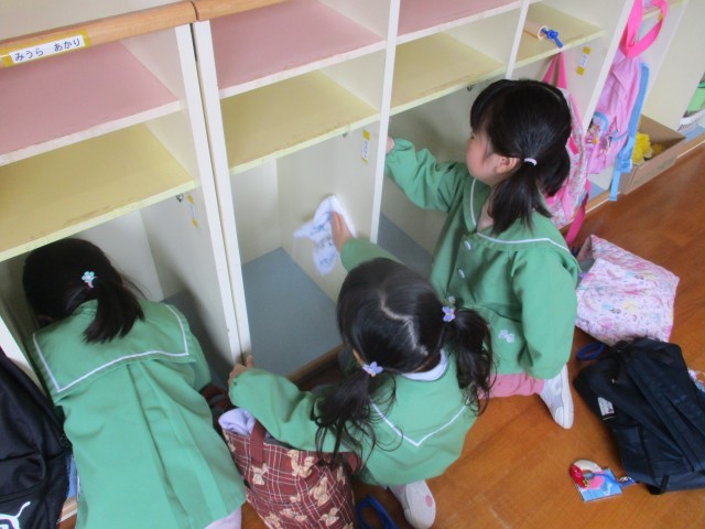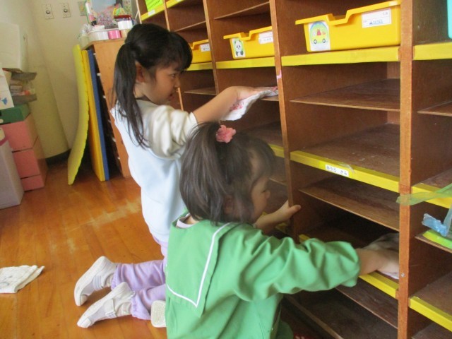 いよいよ、うさぎ組で過ごすのも最後となり、今週は道具箱の整理整頓をしたり、床や棚、下駄箱を拭いたりし、保育室の掃除をしました。「次のうさぎ組さんのためにピカピカにしようね」と伝えると隅々まで丁寧に拭き「綺麗になったよ!」と嬉しそうにしていました。道具箱をぞう組へ移動することを伝えると「やったー!」と大盛り上がりの子どもたち。進級への期待がふくらんでいます。