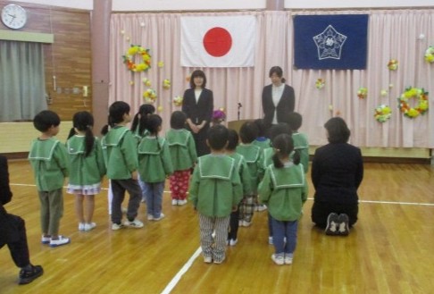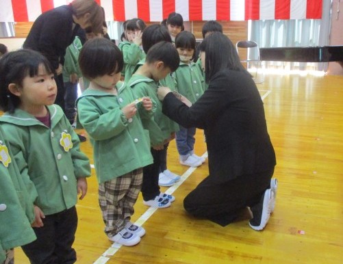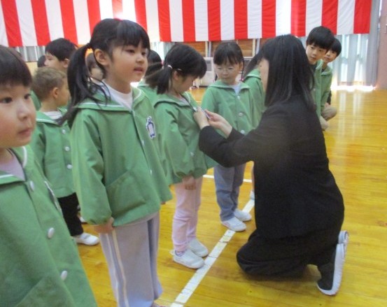 着任式・始業式では、新しい先生方の話や担任の先生の紹介を聞いたり、園長先生から新しい名札をもらったりしました。園長先生から「何色のバッジがほしい?」と聞かれると「青色!」「黄色!」とそれぞれの学年の子どもたちが元気に答え、新しい名札に目を輝かせていました。また、胸につけてもらった名札を嬉しそうに眺めたり、友達が付けてもらう様子をじっと見たりし、一つ学年が上がったことを喜んでいました。明日から友達や先生と元気に楽しく遊びましょうね。
