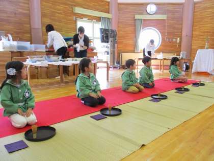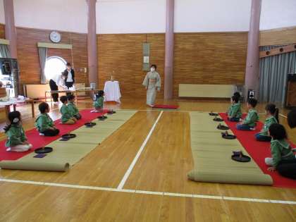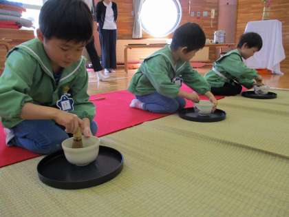 お茶教室(5歳児 ぞう組) 公開日 2021/04/20 更新日 2021/04/20 今日のできごと 4月19日(月) 今年度、初めてのお茶教室。「年長さんになったらするんだ」と楽しみにしていました。正座をすると背筋も自然とピンとなり、袱紗のたたみ方やお茶の点て方、茶筅の持ち方等を教えていただき、最後は自分で点てたお茶を自分で飲みました。「美味しいね」「ちょっと苦いね」と話していました。季節を感じる掛け軸やお花もあり、素敵な雰囲気の中での教室でした。