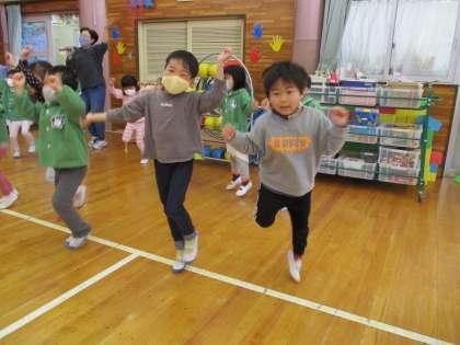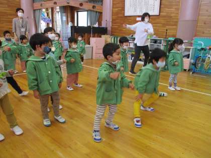 誕生会の後のお楽しみ会では、各学年で日頃から楽しんでいるダンス「ラーメン体操」「がむしゃら行進曲」、ヨサコイ「ドッコイショ」をみんなで踊りました。ぞう組さん・うさぎ組さんは、前に出てお手本になって得意のダンスを踊ってくれました。りす組さんは真似っこしながら楽しく体を動かしていましたよ。これからも、誕生会や季節の行事では、3年齢交流して仲良く遊びたいと思っています。