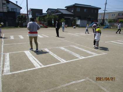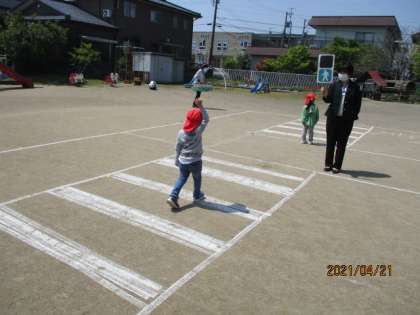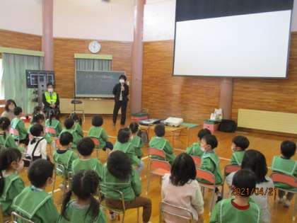 「幼児交通安全教室」がありました。富山市役所から職員の方が来られ、正しい道路の渡り方や交通ルールについて教わりました。道路の渡り方では、子供の視界が狭いため、体全体を使って左右の確認することや背丈が低いため手を挙げることを知り、「そうなんだ。知らなったな」と驚く子もいました。また、園庭に横断歩道をつくり、横断歩行練習を行いました。子供たちは「信号が青になったよ」「車が来た!」と信号の色を見たり、車が来ていないかを確認したりして、安全に渡ることができました。「横断歩道を渡っていても…」「信号が青で渡っていても…」交通事故は起きます!家族で散歩やお買い物に行った際には、家族みんなで交通ルールを確認してみるのもいいかもしれませんね。