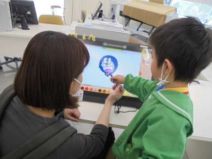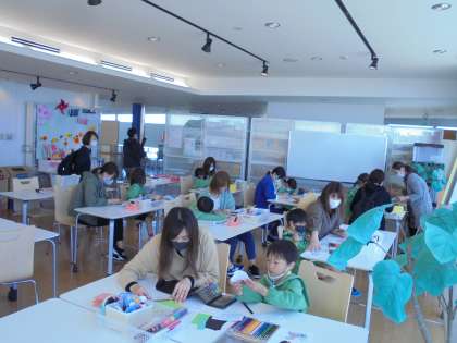 大島絵本館では、親子で仕掛け絵本のワークショップを体験したり、様々な絵本と触れ合ったりして過ごしました。ワークショップでは、「車は何色がいい?」「のりをつけてね」と親子で協力して素敵な絵本が完成しました。また、ヘアピンやカチューシャづくり、CGを使った製作をしている親子もおり、子供たちは作ったものを身に着けて喜んでいました。