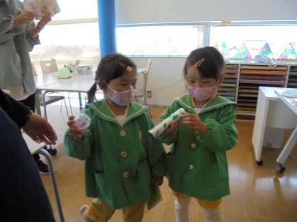 年中児の親子遠足で、大島絵本館と大島中央公園に行きました。今日は、天気がよく遠足日和となり、子供たちは「今日、5時半に起きたよ」「お弁当を作るの手伝ったよ」と元気いっぱいでした。