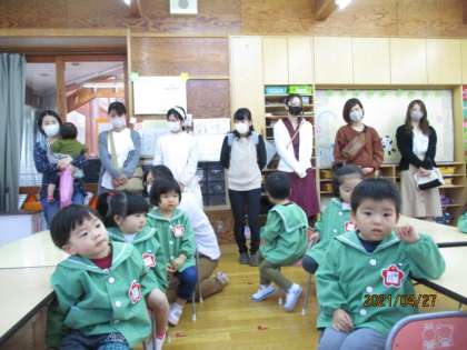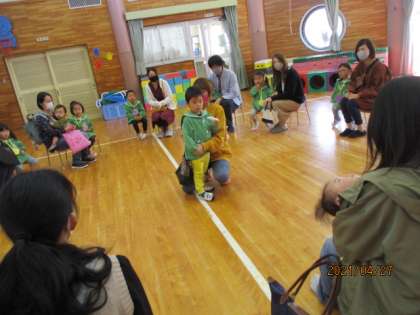 今日は、りす組の保育参観がありました。おうちの人に朝の会で歌ったりお返事をするところを見てもらいました。子供たちは、おうちの人に見守られてうれしそうに大きな声でお返事していました。その後は、遊戯室に行き、親子でペアになって「引っ越しゲーム」や「フルーツバスケット」をして遊びました。椅子に座れるように急いだり、いろいろな遊びをして、先生やお友達と遊ぶ楽しさを味わっていきたいです。