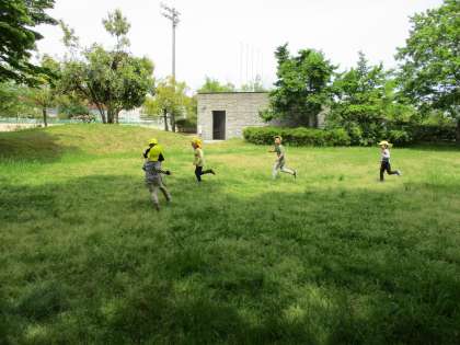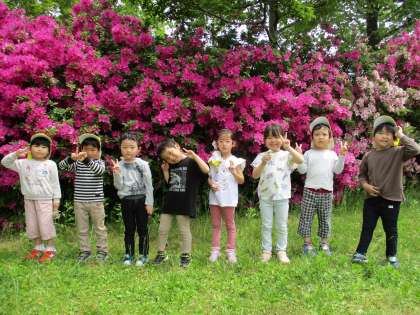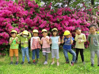 スポーツプラザ公園に行ってきました(5歳児 ぞう組) 公開日 2021/05/19 更新日 2021/05/19 今日のできごと 春の遠足に向けて、道順や交通ルールを知らせながら歩きました。 公園での約束事を聞き、すぐに大型アスレチックへ。グラグラ揺れる橋や網渡りにも挑戦していました。みんなでバナナ鬼をすると、汗だくになって走り、身体をたくさん動かして遊んできました。きれいに咲いた満開のツツジの前でハイ・ポーズ!「楽しかったね」「今度は、みんなで来ようね」と話していました。