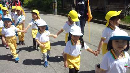 今回は、全年齢で婦中スポーツプラザまで歩いていきました。年長児は年少児とペアになり、先生が「年少さんを頼んだよ」と言うと、「任せて!」と頼もしい姿が見られました。