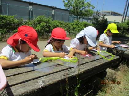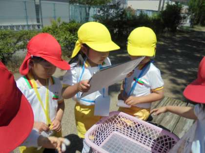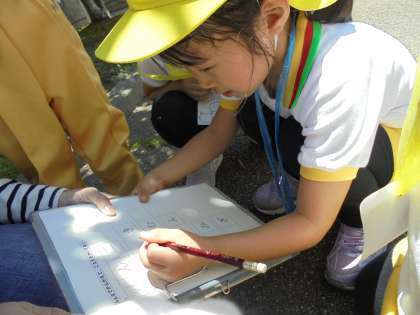 春の遠足 パート3 公開日 2021/05/28 更新日 2021/05/28 今日のできごと 異年齢の友達とグループになり、オリエンテーリングをしました。 婦中スポーツプラザ公園に5か所のポイントがあり、ミッション(クイズやお絵かき、ボール送り)に挑戦しました。 年長児が中心になり、ミッションの内容を読み上げたり、影絵のクイズの答えを書いたりしてくれました。その姿に年中児や年少児は「年長さんってすごいね」「僕も字を書けるようになりたいな」と憧れを感じているようでした。