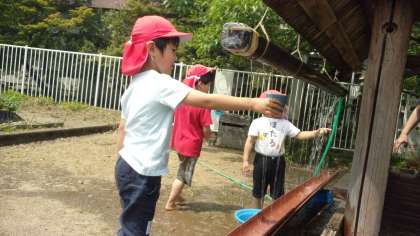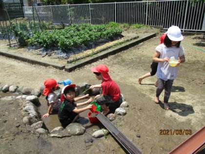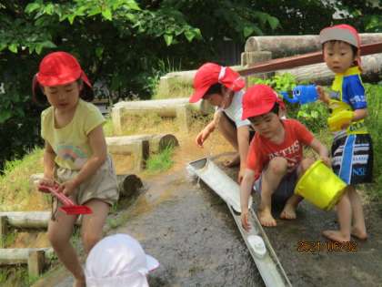 泥んこ遊び(年中児 うさぎ組) 公開日 2021/06/07 更新日 2021/06/07 今日のできごと 子供たちが楽しみにしていた泥んこ遊びが始まりました。泥遊び用の服に着替えると、足や服が汚れてもへっちゃらな子供たち。雨どいに水を流せば、「流しそうめんだ」と言い、船や砂場のカップ等、いろいろな物を流すことを楽しんでいます。また、泥水にお尻をつけて、足に泥をたっぷりつけ、泥パックをしている子もいました。 先生達も子供たちと一緒に泥んこになって遊んでいます。