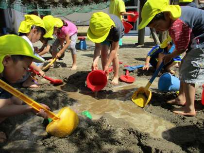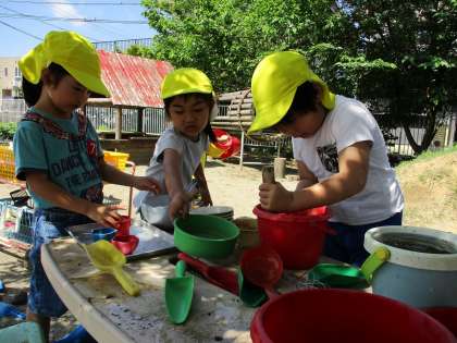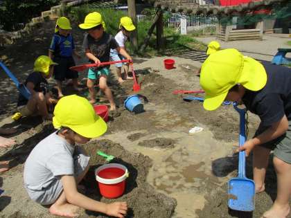 砂・水遊びは最高です(5歳児 ぞう組) 公開日 2021/06/07 更新日 2021/06/07 今日のできごと 6月2日(水) 暑い日は冷たい水と裸足で触れる砂の感触が最高に気持ちいいのか、片付けになってもなかなか片づけようとせず、中に入りたくない子供たち。友達や先生と一緒にスコップで山や川をつくって、雨どいを利用して水を流したり、コーヒー牛乳や桑の実を使ってぶどうジュースをつくってごちそうしたりしています。しばらくの間は、おもいっきり汚れを気にせず、砂・水遊びが続きそうです。