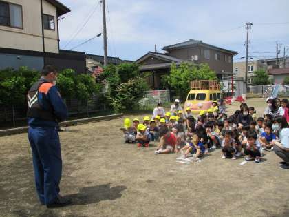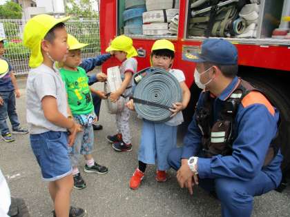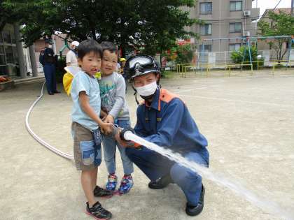 年齢ごとに交代で消防車を見学した後、年長組は放水体験もさせていただきました。ホースを伝って水が勢いよく出ると、驚きのあまり声が出る子もいました。今回の体験で、将来消防士さんになりたいという気持ちをもった子もいたようです。