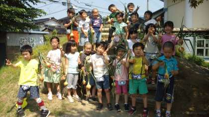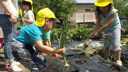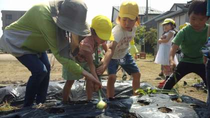 年中児クラスの11月に、子供たちが植えた玉ねぎが育ち、今日収穫の日を迎えました。大きくなって、一人では抜けないくらいに根が張り、友達に手伝ってもらう子、勢い余って尻もちをついてしまう子もいました。自分で収穫したものを一つ持ち帰り「今日は何をして食べようかな」「カレーがいいな」「ぼくは肉じゃが」と、夕食で食べることを楽しみにしていました。
