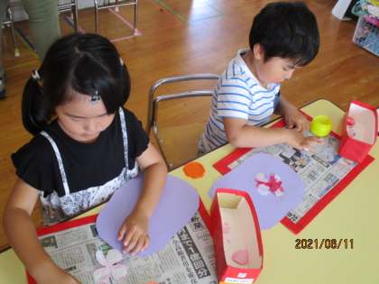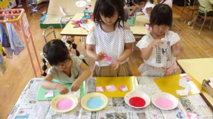 うさぎ組では、絵の具で紙を染めてあじさいを作りました。じわじわと色が広がったり、混ざったりする様子に「きれいだね」「赤と青で紫になったよ」と驚く子供たち。「ちょっと色が濃いかな」と心配している子もいましたが、乾くと模様が浮かび上がり、