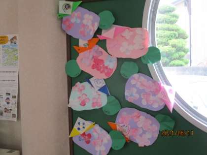 「これも素敵だね」と喜んでいました。あじさいの土台も子供たちが切り、形や模様が一人一人違い、素敵なあじさいができました。