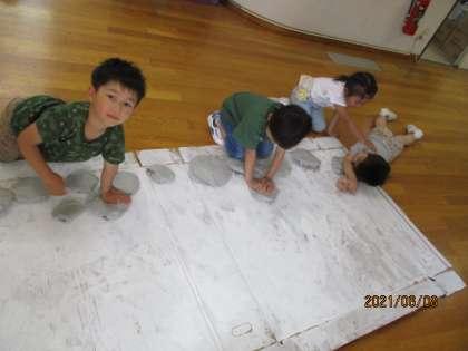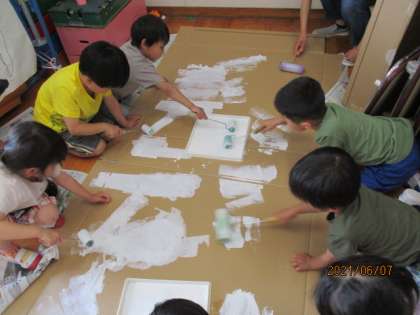 うさぎ組で盛り上がっている忍者遊び。子供たちの中には、忍者にあこがれている子が多く、手裏剣や的を作って遊んでいます。忍者の絵本を読むと、隠れたり、手裏剣を投げたりする修行をしていることが分かり、みんなで忍者の隠れ場を作りました。先生と数名の友達で大きな段ボールに白の絵具をつけて石壁を作っていると、「僕もやりたい」と仲間が増え、石壁ができあがりました。「早くこれに隠れたいな」と楽しみにしていました。