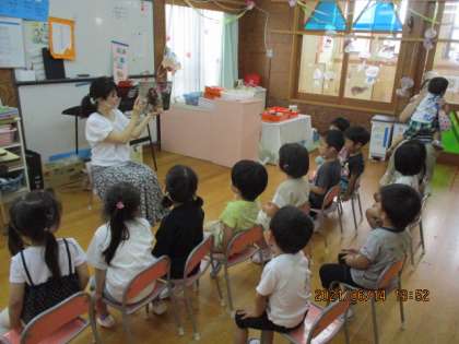 今日は、りす組で保護者の方がお話しを読んでくださる『読み聞かせの会』がありました。お化けや昆虫が出てくるお話、みんなが大好きなアンパンマンが出てくる紙芝居などを3冊読んでくださいました。カブトムシが出てくるお話を見た後には、「僕カブトムシ捕まえたい!」「ツノを使ってお相撲するんだね。すごい!!」と喜んで話をしていました。