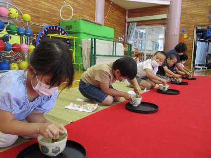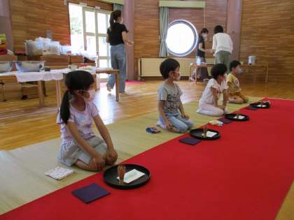 お茶教室(5歳児 ぞう組) 公開日 2021/06/27 更新日 2021/06/27 今日のできごと 6月21日(月) 今月も楽しみにしていたお茶教室。季節のお花や掛け軸が飾られました。子供たちも3回目なり、作法も少しずつ身に付いてきたようです。袱紗のたたみ方に少し苦戦しながらも、先生に褒められると嬉しそうにしていました。