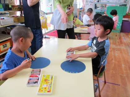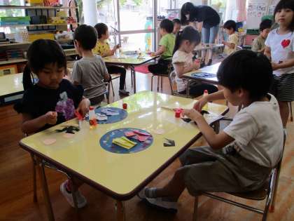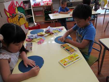 7月7日の七夕に向けて、少しずつ飾りづくりをしています。この日は織姫と彦星の製作をしました。七夕の由来を話すと忘れていた子も多く、願い事を何にしようかと悩んでいました。お家では幼稚園から配布した短冊3枚に各自の願い事や、ご家族の願い事を書いて持ってきてもらっています。園で作成している飾りも出来上がったものから飾り、学校評価関係者の方々や長寿会の皆さんとの『七夕の集い』を楽しみに待ちたいと思います。