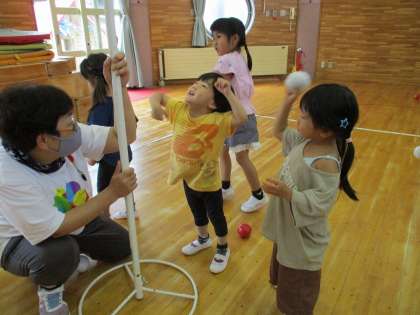 年長組だけで玉入れをしてると、年少組の保育室からこちらを見ている視線を発見!「一緒にしよう」と声をかけると、嬉しそうに遊戯室へ出てきたりす組さん。