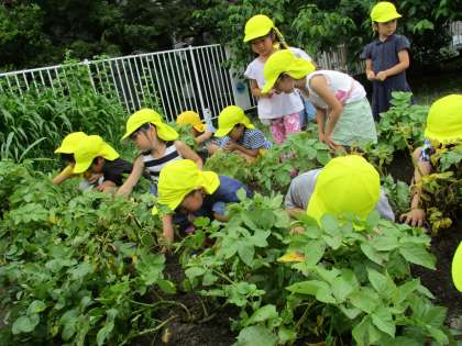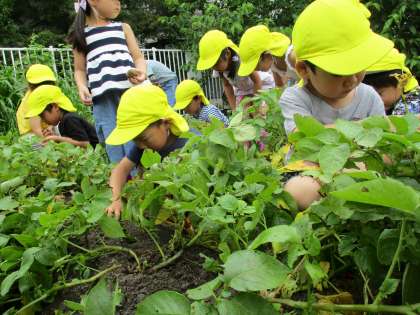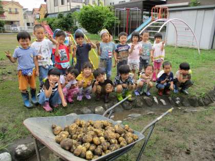 梅雨の晴れ間を見て、みんなで一斉にジャガイモを掘りました。年長の子供たちが年中クラスの時に植えたジャガイモです!葉の部分を抜くと、土からジャガイモがつながって顔を出しました。「やった!」「見えたよ」と土の中から、必死にジャガイモを探す子供たち。全部で291個のジャガイモを収穫しましたよ。来週14日の給食メニューは『夏野菜カレー』。年長児の子供たちが手伝ってカレーづくりをします。毎朝、水やりしたり収穫したりしている夏野菜のナスやピーマン、先月収穫したタマネギ、そしてこのジャガイモが材料として加わります。今から楽しみにしているようです。