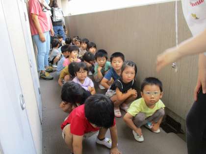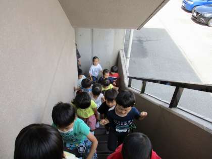今月の訓練は、井田川が氾濫したことによる水害の訓練をしました。「雨がひどくて井田川が氾濫しそうです。遊戯室に避難しましょう」と放送が入り、遊戯室へ避難しました。その後、氾濫水域になったということで、向かいにあるルーラル速星のアパートの4階まで登りました。水が流れてきたら、高い場所に上り、自分の命を守る大切さを学びました。
