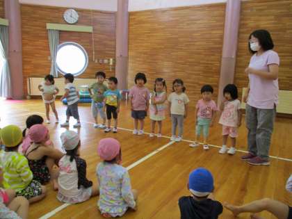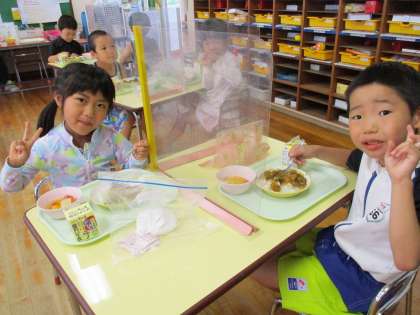 給食室から良い匂いがし始め、タイマーが鳴りました。「やった!」「できたね」と早速、食べる準備をする子供たち。自分たちのつくったカレーは格別だったようで「美味しかった」「ナス、嫌いだったけど、幼稚園のナスは美味しいよ」と話す子もいました。何度もおかわりして、たくさん食べて大満足。りす組さんからも「ありがとう」と言われ、嬉しそうでした。改めて、食育の大切さを感じました。
