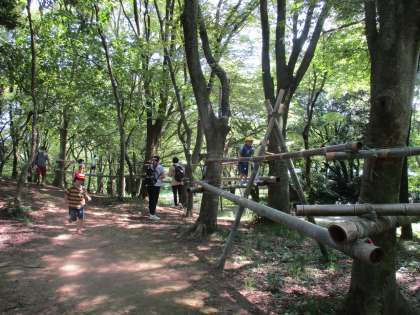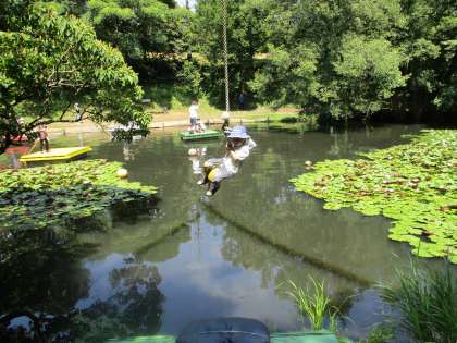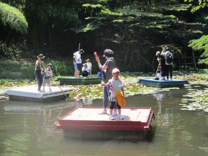 ザリガニ釣りが終わり、三楽池の方に移動して、いかだ乗り、ターザンロープ、竹ジャングル、池ジャングルに挑戦しました。中でもターザンロープは池に飛び出していくので、最初は怖がる子もいましたが、一度勇気をもって挑戦してしまえば楽しさが分かり、何度も繰り返しながらターザンのように「あ〜あ〜あ〜」と叫びながらしていました。いかだに乗って、きれいに咲いている蓮の花の近くまで行ったり、高い場所に上って竹のアスレチックをしたりと、それぞれに遊びたい場所に行って満喫していました。