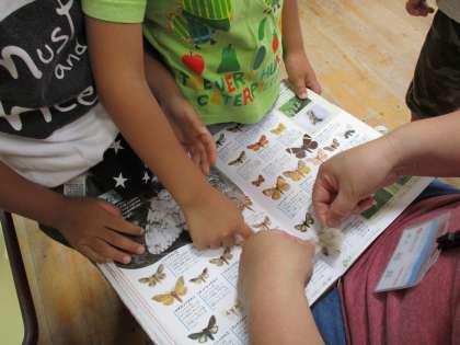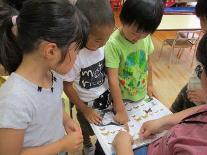 ぞう組のテラスの柱にずっと朝からいた蛾を見付け、図鑑を見ながらどの蛾なのか気になっていた子供たち。友達が捕まえてきてくれた蛾の羽を広げ、模様や色を図鑑と見比べましたが、どれか分からず…。分かる友達がいたら、夏休み明けに教えてくださいね。