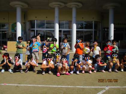 2学期に入って虫探しに興味をもった子供たち。今日は、いろいろな色のセロハンでとんぼのめがねと画用紙に模様を描いて羽をつくりました。子供たちは、めがねの色を決めたり、どんな模様の羽にするかを考えながら、とんぼづくりを楽しみました。めがねをつけるといつもと景色が変わり「みんな緑色に見える」「土も赤色になった」と喜んでいました。最後はみんなでめがねをつけて写真を撮りました。