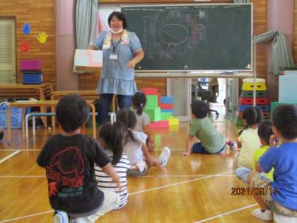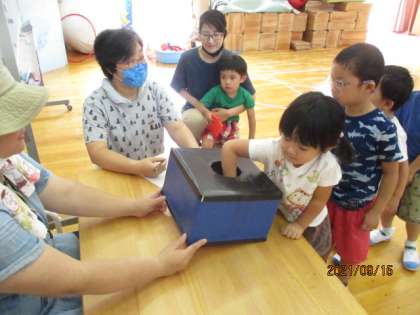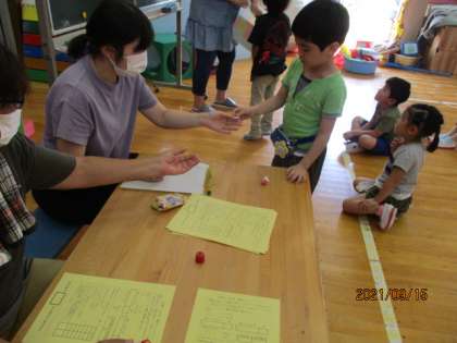 子供たちは、園長先生から話を聞いて「運動会の日のお家の人が見る席を決めるんだね。何番かな〜」「早く運動会にならないかなあ」とワクワクしていました。帰りには、自分で「今日、くじ引きをして運動会でお母さんが見る席を決めたんだよ」とお家の方に話をしている子もいました。