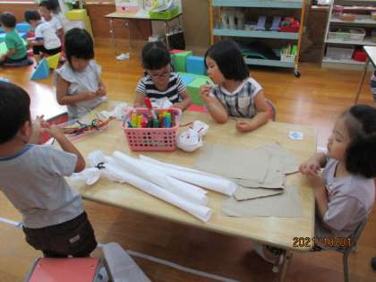 今日の午後は、少し雨も降っていたので、遊戯室で運動会ごっこをしました。「明日は運動会だね!」「お父さん・お母さんと親子競技一緒にするの楽しみだな」と期待が膨らみました。雨が降るのか心配で、お家でてるてる坊主をつくったというお友達がいたので、りす組でも、てるてる坊主づくりをしました。みんなで大きなてるてる坊主もつくって、「明日は晴れますように」とお願いしました。きっと明日はいい天気になるでしょう!幼稚園で待っています。