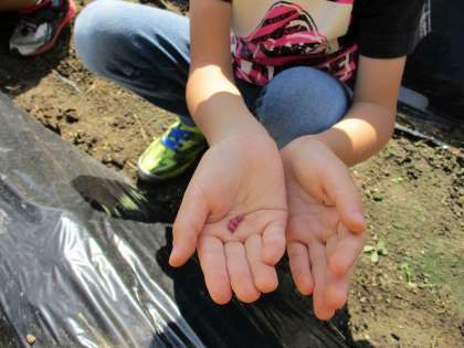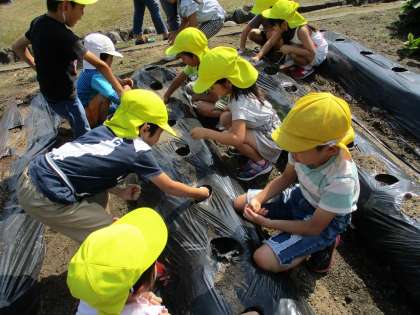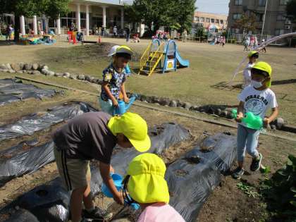 大根の種を植えました(5歳児 ぞう組) 公開日 2021/10/01 更新日 2021/10/01 今日のできごと 9月24日(金) 夏野菜を育て終わった畑に今度はどんな野菜を植えようか話し合い、まずは冬の野菜から調べていた子供たち。昨年の年長さんの姿を思い出して「ぼくたちも大根植えよう」ということになりました。「大根は白色なのに種はピンク色なんだ」と驚きつつ、植え方を教えてもらって穴に3粒ずつ種を植えていきました。水をかけながら「大きくなってね」「甘くなってね」と話していました。