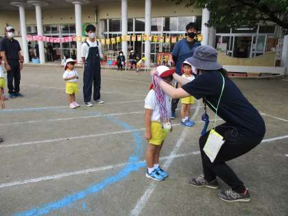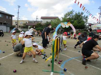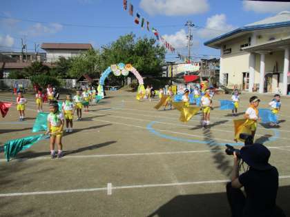 速星幼稚園運動会は年齢別にて4歳児うさぎ組からスタート!フラッグ演技「やってみよう」を披露しました。子供たちは、お家の人に見てもらうことを楽しみにしていて、大きな声で「トライ!トライ!」と元気に声をかけたり、真剣な表情で演技し隊形移動をしていました。親子競技では、親子で力を合わせてキラキラボール投げをしました。相手の陣地にボールを投げ入れ、少ない方が勝ちというルールです。どちらのチームも気合が入り、玉の数もきん差でいい勝負でした。閉会式では、先生からメダルをもらい、PTAの方からプレゼントをいただき、嬉しそうな子供たちでした。