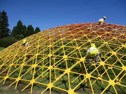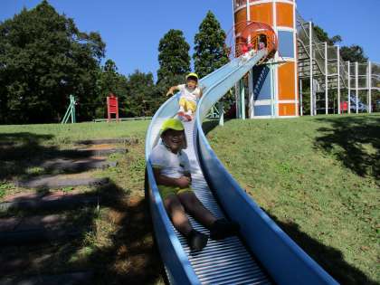 秋の遠足(5歳児 ぞう組)パート2 公開日 2021/10/07 更新日 2021/10/07 今日のできごと 写真撮影の後は、芝生広場に到着!荷物を置いてアスレチックで遊びました。長い滑り台を連なるように滑ったり、網のところを渡ったりと自分のしたい遊びを選んで、秋晴れの下、思い切り身体を動かしていました。ドングリ拾いをしていた子は、たくさんポケットに詰め込んで満面の笑み。袋に入れ替えて、大事そうにリュックに入れていました。