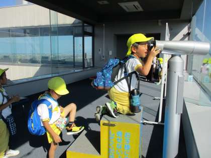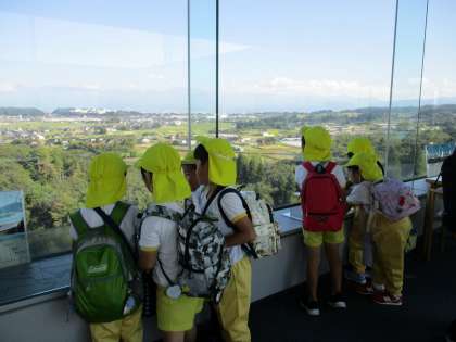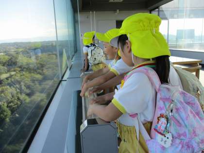 秋の遠足(5歳児 ぞう組)パート3 公開日 2021/10/07 更新日 2021/10/07 今日のできごと 午後からはぞう組さんだけ、展望台まで行きました。展望台を見上げて「すごい高いね」「きゃー!」と歓声が上がりました。エレベーターで上まで上がって扉が開いた瞬間には、もっと大きな声が上がりました。双眼鏡で覗いたり、ガラスの床をドキドキしながら登ったりしながら、速星幼稚園を探したりもしました。たくさん歩いて疲れたけど、ぞう組さんだけの『特別感』で、なんだか嬉しそうにしている子供たちでした。