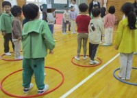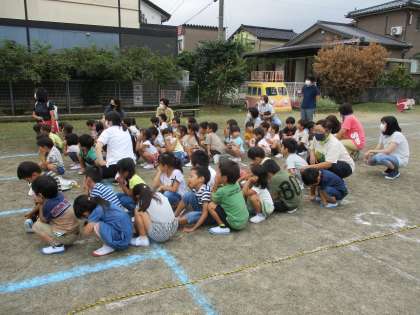 毎月一回行っている避難訓練。今回は、降園時間に地震が発生、その後給食室が火事になったという想定で、避難と同時に緊急連絡網で保護者の方に知らせ、迎えに来ていただきました。いつもと違う訓練に戸惑う子もいましたが、落ち着いて行動していました。