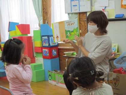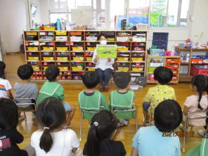 うさぎ組では、食いしん坊のお月様の話を読んでもらいました。バナナを食べたら三日月になったり、パンケーキを食べたら満月になったりとお月様が食べたもので形が変わるお話です。子供たちは「次は、ピザかな」とお月様の形を想像しながら、おはなしを聞いていました。