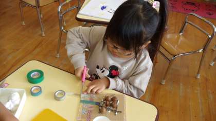 秋の遠足や散歩で拾ったどんぐりや枝を使って壁面飾りをつくりました。虫が好きなうさぎ組さんはどんぐりや枝をうまく並べて、クワガタやカブトムシ、トンボなどをつくっていました。テープや布などの材料も使い、素敵な飾りができあがりました。