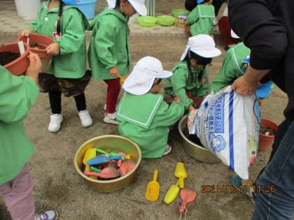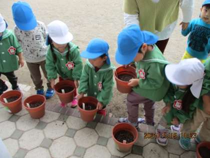 婦中郵便局から毎年この時期にチューリップの球根をいただいて球根植えをしています。赤・黄・ピンク色の花が咲く球根の中から、1人ずつ鉢に3つの球根を植えました。「全部の色を1つずつ植えよう」「ピンクが好きだから3つともピンクにする」と言いながら植えていました。春に咲くのが今から楽しみだね!