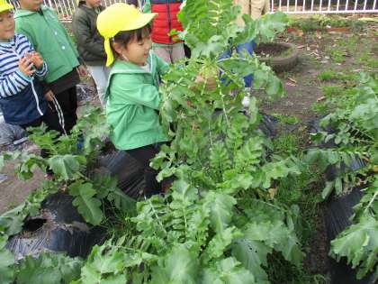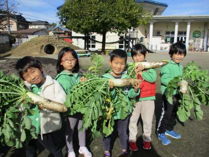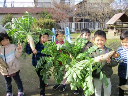 大根を収穫しました(5歳児 ぞう組) 公開日 2021/11/30 更新日 2021/11/30 今日のできごと 11月30日(日) 9月24日に植えた大根の種から少しずつ芽が伸び、水やりをしながら育ててきた大根が、収穫の時期を迎えました。力いっぱい引き抜こうとするのですがなかなか抜けず、大根を持って踏ん張り、みんなから「頑張れ!」と応援され、やっとの思いで引き抜きました。大きく育った大根にビックリ!一人1本ずつ持ち帰りました。お家で食べるのを楽しみにしていました。