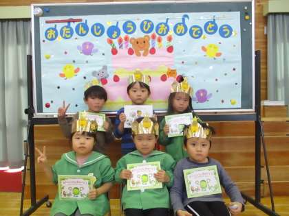 今日は11月生まれの誕生会がありました。今月はぞう組さんが一人、うさぎ組さんが5人の友達がお誕生日でした。質問コーナーでは、好きなキャラクターや動物、果物を聞かれ、大きな声で答えていました。