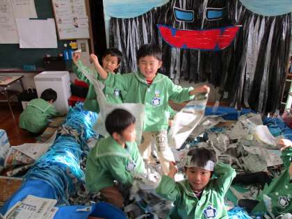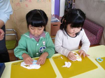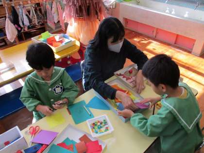 先日から少しずつ話し合いを進め、サンタやトナカイになりきって遊んでいる子供たち。設計図を見ながら「チョコレートタワーがあったらいいね」「温泉があると楽しそう」という意見が聞かれ、みんなで遊びに必要なものをつくりました。温泉のお湯にする新聞紙をちぎりながら、新聞紙の中に潜って深さを確かめたり、紙粘土でイチゴをつくって葉っぱや粒々を付けて、本物そっくりにしたりとそれぞれが友達と話しながら楽しんでいました。これからどんなサンタの森が出来上がるのか、今から待ち遠しいです。
