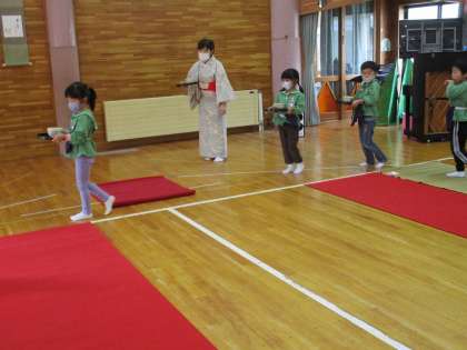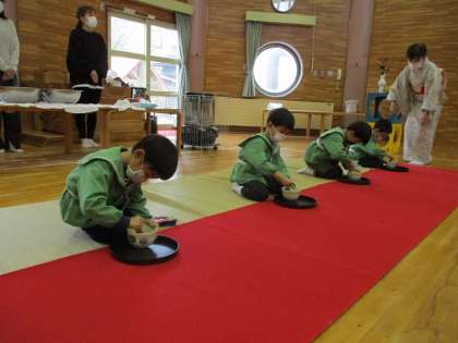 今月のお茶教室は、12月らしく、獅子柚子が飾られ、お菓子もゆきだるまの絵が描かれているかわいらしいものでした。お茶を点てるだけでなく、お運びも上手になってきました。
