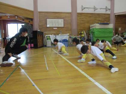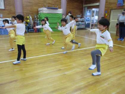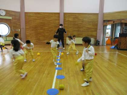 5歳児も小川耕平先生と一緒に楽しく体を動かして遊びました。「前」と言われたら前に跳ぶ、「右」と言われたら右へ跳ぶのはできるのですが、「前」と言われ反対の後ろに跳び、「右」と言われ反対の左に跳ぶ支持は難しく、子供たちは頭と体をフル回転させながら動いていました。毛糸のボールを使っての陣取りゲームも盛り上がり、相手にたくさんボールを入れた方の勝ちだったのですが、一つずつ投げる子、何個か集めてから投げる子とやり方は様々で、見ている方も楽しかったです。