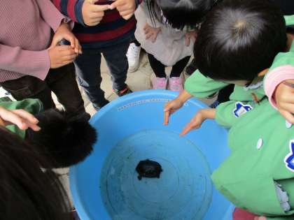 呉羽幼稚園が昨年休園となり、3月末から新しく速星幼稚園に仲間入りした亀のカメ吉。今年も冬が近づきだんだん寒くなってきてエサも食べずにじっとしていることが多くなってきました。「もしかしたら冬眠の時期じゃないの」「冬眠って何」と子供たちで話していました。「森にいるクマと一緒で冬眠するんだよ」と伝えると、初めて知った子も多く、驚いていました。「春になったら会おうね」と言いながら「あれ?春になって目を覚ますときには1年生じゃないの」と気付き「さようならだね」と少し淋しそうでした。
