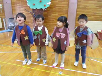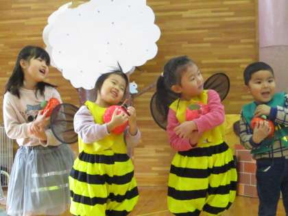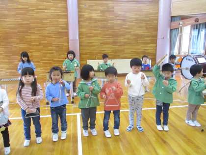 生活発表会が終わり「今度は違う役でやりたい」「他の楽器もしたい」と発表会ごっこを楽しんでいます。劇では、友達の台詞や動きを覚えており、自分から前に出て台詞を言っていました。楽器では、合奏で使っていた楽器だけでなく、年長児が使っていた大太鼓やウィンドチャイム等も体験しました。いろいろな楽器を体験した後、みんなで発表会で演奏した「ミッキーマウスマーチ」を合奏しました。中には「年長になったら、大太鼓がしたい」と来年の発表会を楽しみにしているお友達もいました。