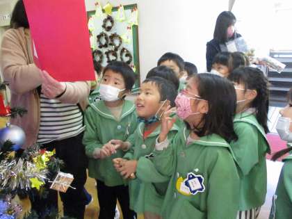 幼稚園のクリスマスツリーに新しい飾りを購入しました。みんなで付けに行くと、なっ!なんと!サンタさんからの手紙を発見しました。手紙には「速星幼稚園のよいこのお友達。お土産をたくさん持って行きますね」と書いてありました。りす組さんやうさぎ組さんに伝えると「きゃー!」「嬉しいね」と話し、サンタさんからの手紙を見ていました。クリスマス子ども会で会えることを楽しみにしている子供たちでした。