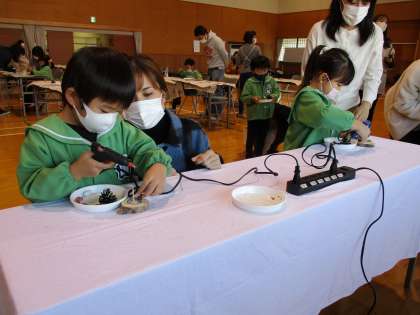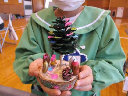 立山青少年自然の家の方に教えていただきながら、速星公民館にて親子クラフト教室を行いました。松ぼっくりやドングリなどの自然物を使い、それぞれがクリスマスや車、町、友達と遊ぶ等テーマを決め、親子で話し合ってつくっていました。もうすぐクリスマスということもあり緑色に塗られた松ぼっくりに模様を描いて、クリスマスツリーにしている子も多くいました。子供たちの作品を紹介し合うと、どこからともなく拍手が起こりました。どれも、親子で思い出に残る素敵な作品になったと思います。お家で飾っていただき、楽しかった今日の活動を話してほしいです。